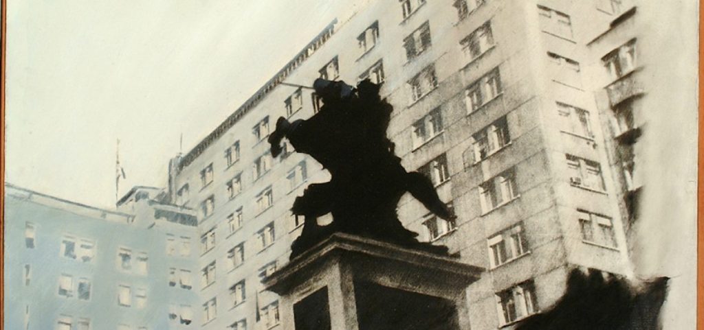 Zamudio traslada imágenes a la tela mediante una técnica fotográfica, las que luego interviene aprovechando sus claroscuros e intensificando el efecto con la superposición de capas pictóricas. En las obras presentadas, el artista rescata hechos e imágenes de la ciudad de Santiago, en una especie de recuperación de la memoria histórica.